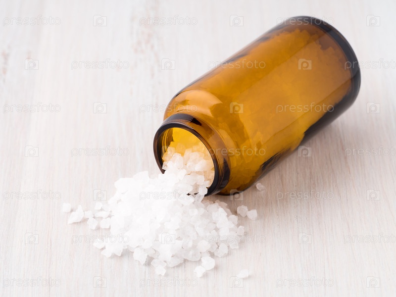 Стеклянная банка с крупной морской солью, лежит на светлом деревянном столе, разбросаны кристаллы соли