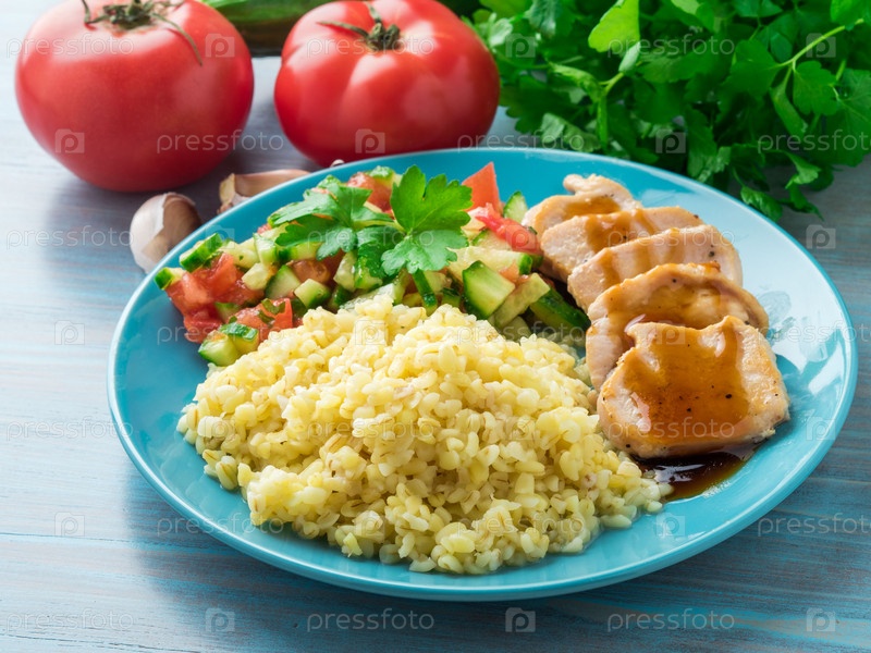 Мясо индейки, обжаренное с соусом терияки, салат из огурцов, помидоров, овощи, гарнир из булгура, вид сбоку