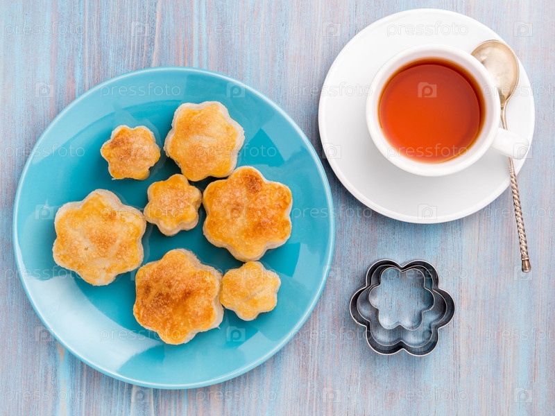 Традиционный завтрак с чашкой чая и сладкой выпечкой. Тарелка булочек, кружка чая, ложка на деревянном синем столе, вид сверху, деревенский стиль