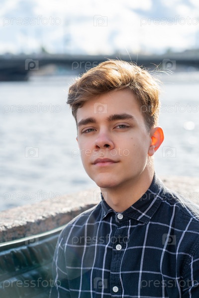 Портрет молодого парня, брюнета с темными волосами, кавказца. Крупный план парня, мальчика, мужчины, смотрящего в камеру. На улице в городе у воды