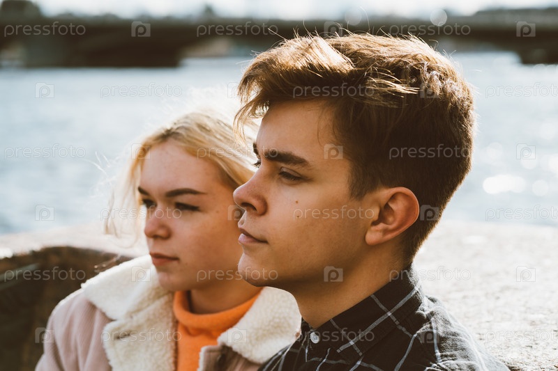 Подростки в любви сидят на набережной в центре города, отдыхая на осеннем солнце. Концепция первой подростковой любви, начало отношений. Мальчик и девочка встречаются на свидании, пара. Мальчик крупным планом