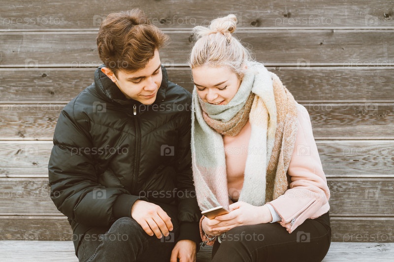 Концепция подростковой любви. Симпатичный брюнет парень фтв молодая блондинка девушка