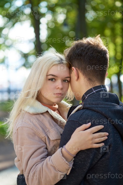 Парень и девушка стоят обнявшись. Первая любовь, подростковая любовь, новые чувства и отношения. Осень, Парк
