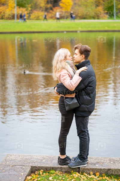 Концепция подростковой любви. Симпатичный брюнет парень фтв молодая блондинка девушка