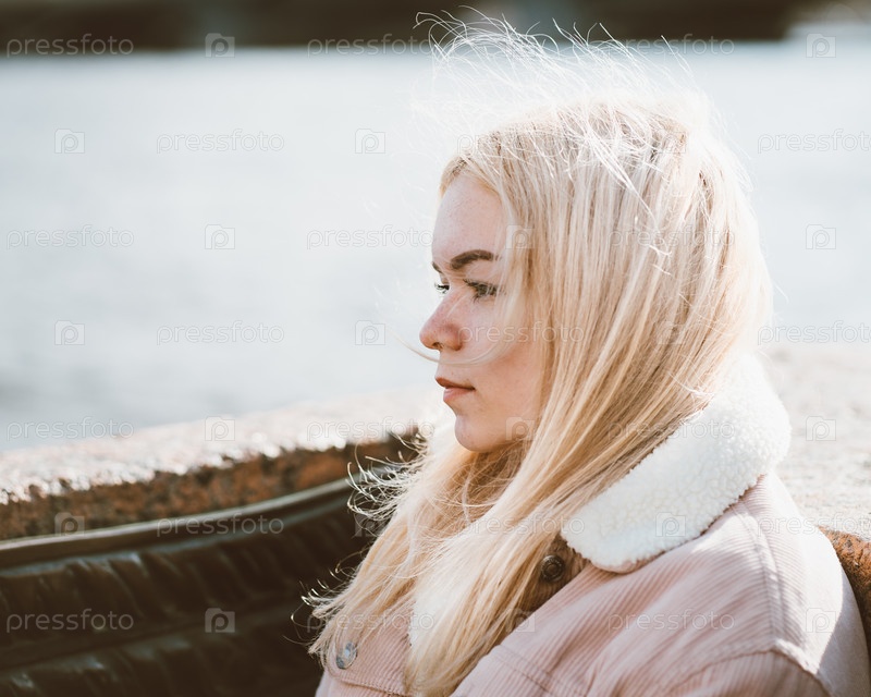 Портрет молодой девушки, блондинки с обесцвеченными волосами, кавказской внешности. Скандинавский стиль. Крупный план подростка, смотрящего мимо камеры в городе у воды