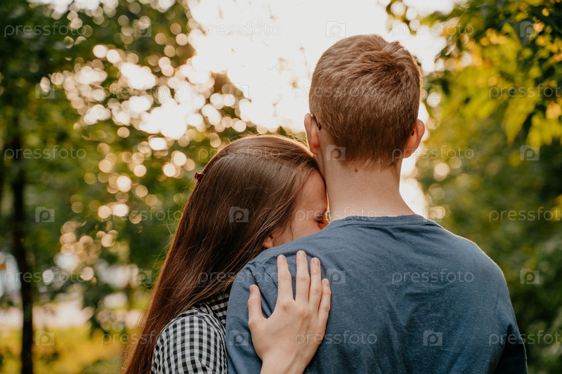 Девушка положила голову ему на плечо, любовь в парке, подростковая пара
