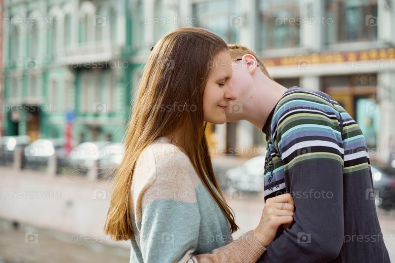 Портрет счастливой пары, обнимающейся в центре города, рыжеволосый мужчина в очках целует или шепчет женщину с длинными волосами