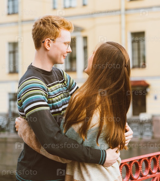 Девушка с длинными густыми темными волосами обнимает рыжего мальчика в синей футболке на мосту, молодая пара. Концепция подростковой любви и первого поцелуя, искренние чувства мужчины и женщины, город, набережная. Вертикальный