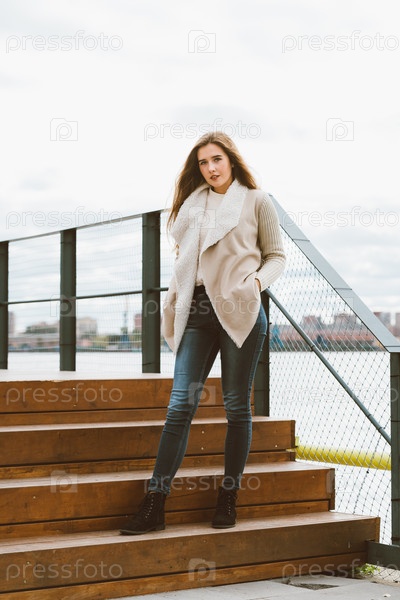 Красивая молодая длинноволосая кавказская женщина стоит на ступеньках деревянной платформы на набережной у пирса в порту
