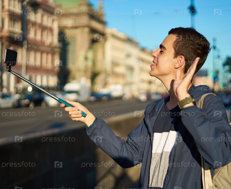 Молодой человек с телефоном стоит на улице большого города и машет рукой