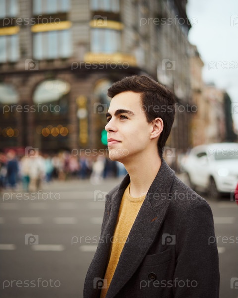 Красивый стильный модный мужчина, брюнет в элегантном сером пальто, стоит на улице в историческом центре Санкт-Петербурга. Молодой человек с темными волосами, густыми бровями