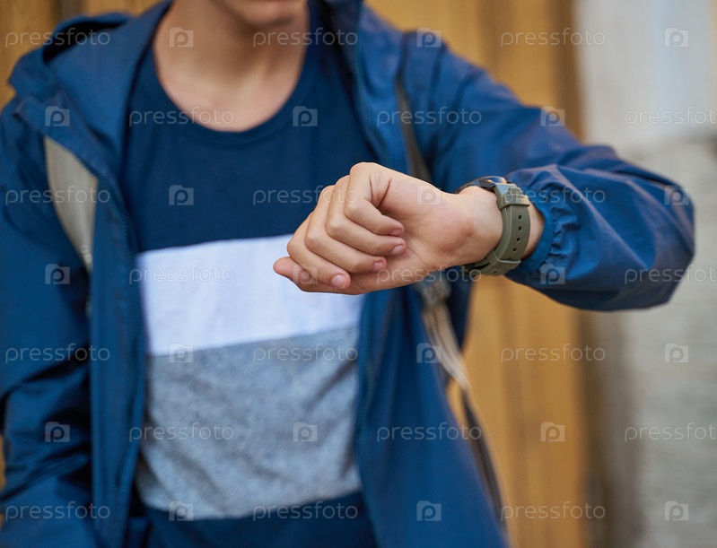 Молодой человек смотрит на часы, ожидая встречи с друзьями. Мужчина ждет женщину на улице города на свидании, глядя на часы