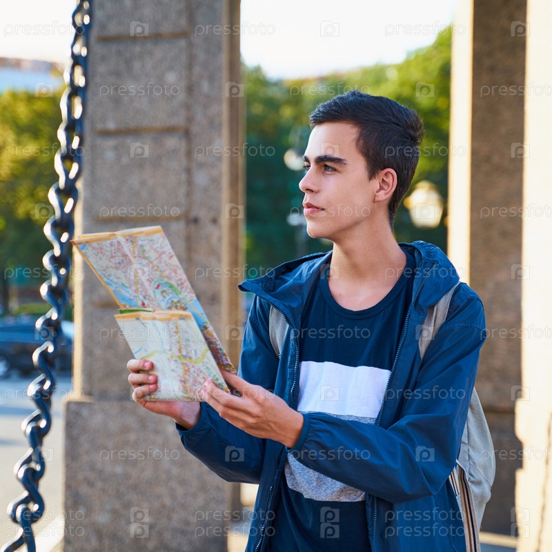 Молодой человек стоит на улице большого города и смотрит на гида, турист в Санкт-Петербурге ищет маршрут