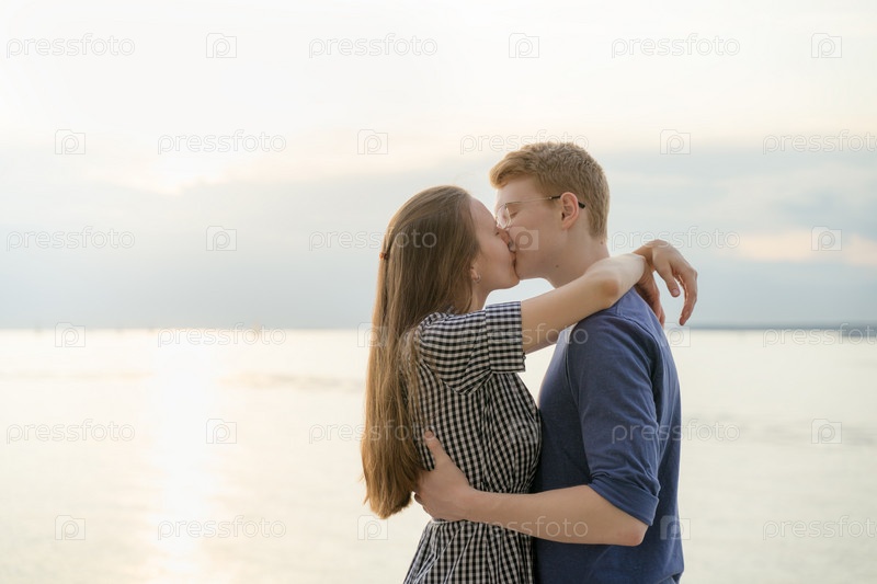 Подростковая пара целуется на пляже, мальчик и девочка обнимаются во время поцелуя крупным планом