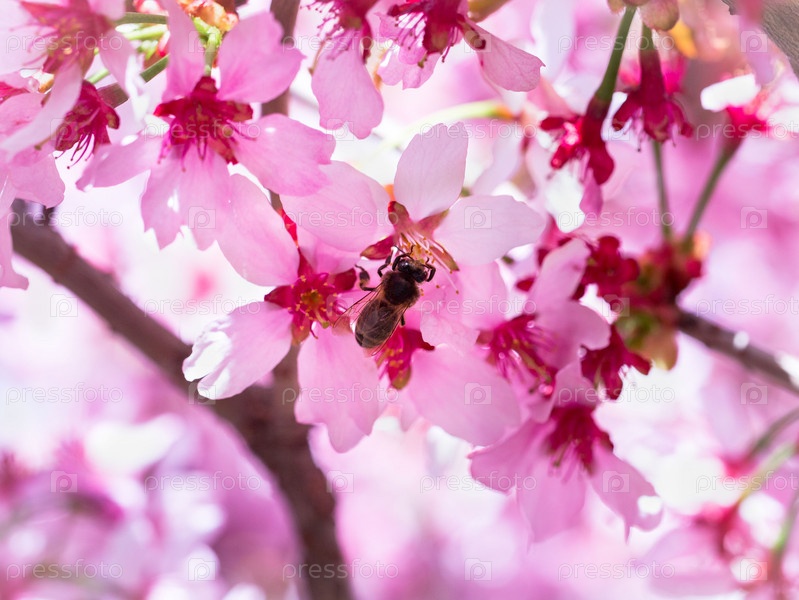 Насекомое пчела полетела на ветку цветущей вишни, собирая нектар. Солнечный день весной. Опыление