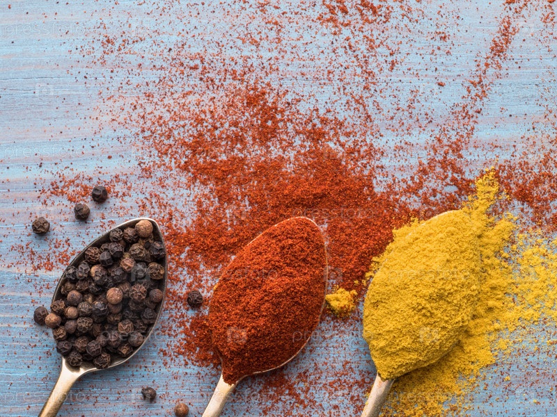 Молотые специи - куркума, карри, черный перец, паприка в золотых ложках на синем деревянном столе. Вид сверху, крупный план
