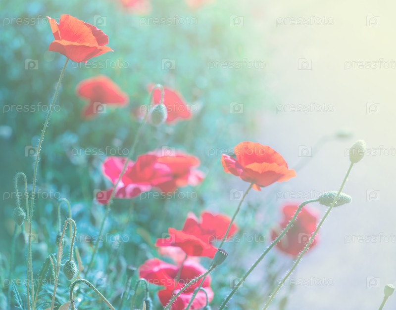 Большие красивые красные бутоны мака на зеленом фоне травы и растений, тонированное изображение