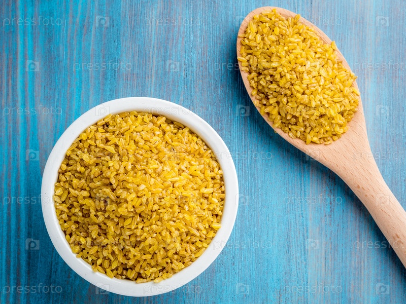 Белая миска и деревянная ложка с сырым булгуром на синем деревянном фоне. Вид сверху