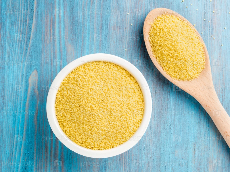 Белая миска и деревянная ложка с сырым кускусом на синем деревянном фоне, вид сверху. Традиционная марокканская еда