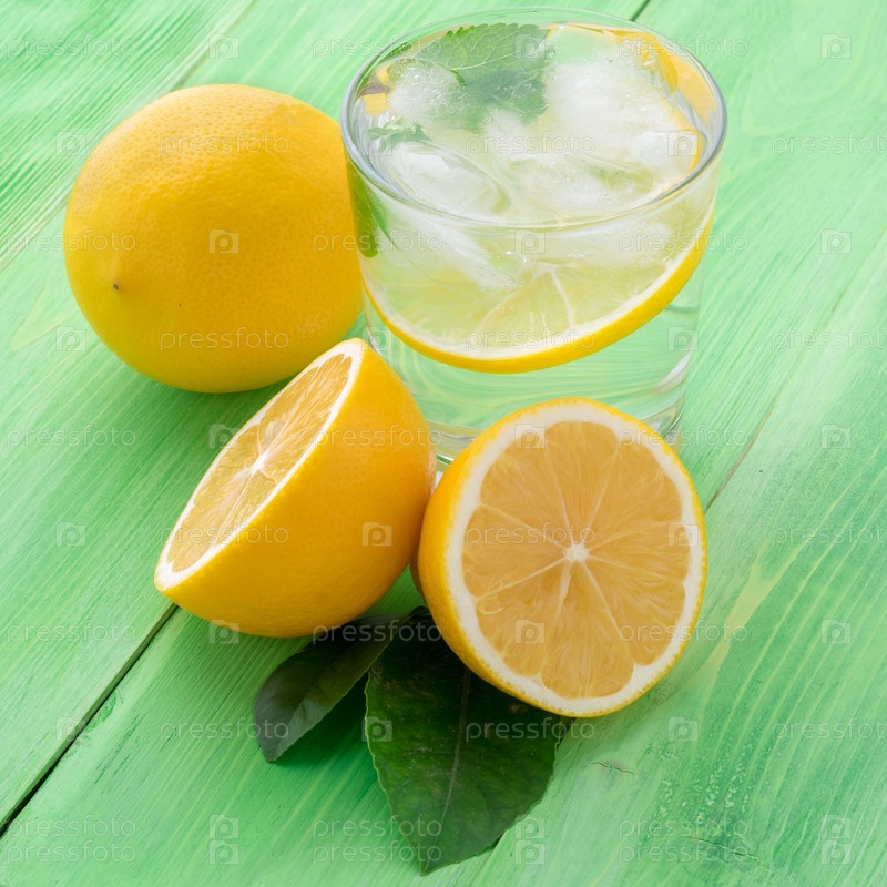 Лимонад в стакане, половинка лимона, свежие листья на зеленом столе. Освежающий холодный напиток из воды со льдом, мятой и ломтиками лимона, вид сбоку