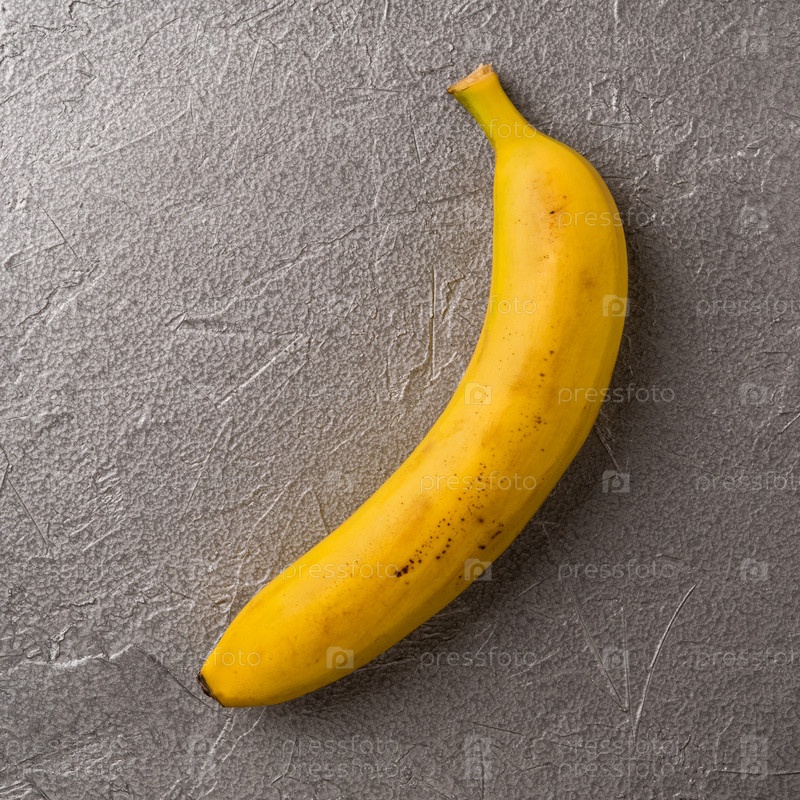 Простое изображение одного спелого желтого банана на сером металлическом фоне