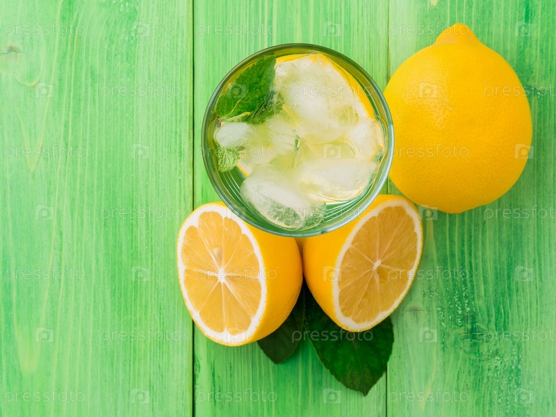 Холодный напиток из воды, кубиков льда, мяты и лимона в стакане, лимонад