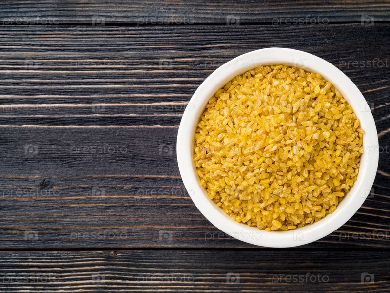 Белая миска с сырым булгуром на темно-коричневом деревянном фоне. Вид сверху, пустое место для текста