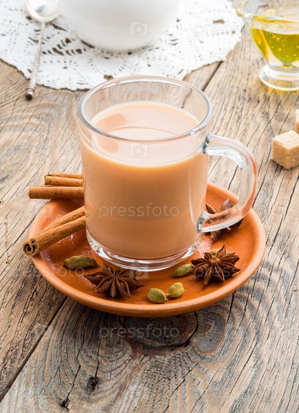 Масала — индийский напиток на празднике Холи. Чай с молоком и специями в стеклянной кружке