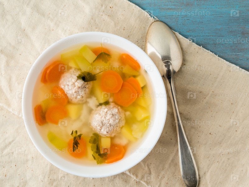 Тарелка супа, чашка бульона и овощей, фрикадельки из индейки и курицы, вид сверху