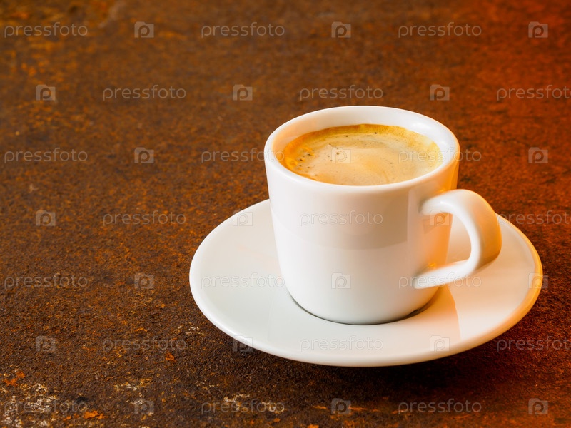 Черный пенистый кофе с пеной в белой чашке с тарелкой на ржавом металлическом столе, теплый свет лампы кофейни, вид сбоку, пустое место для текста
