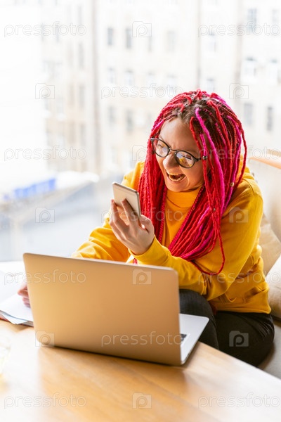 Концепция цифрового кочевника. Девушка-фрилансер, удаленно работающая на ноутбуке в кафе, коворкинге