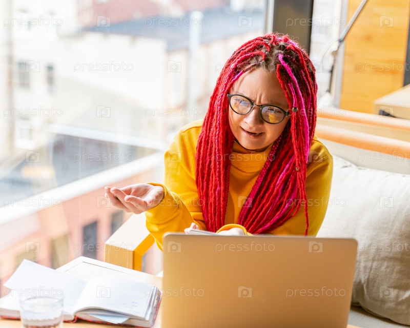 Концепция цифрового кочевника. Девушка-фрилансер, удаленно работающая на ноутбуке в кафе, коворкинге