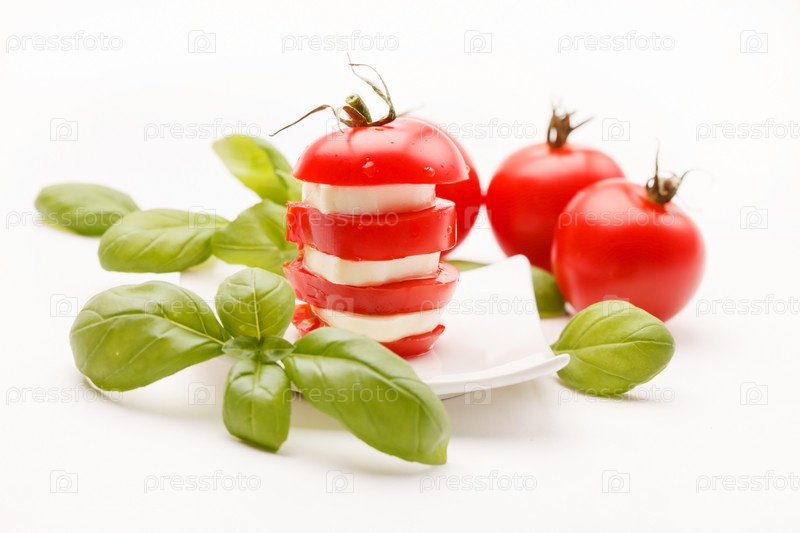 Помидоры и сыр моцарелла, украшенные листьями базилика
