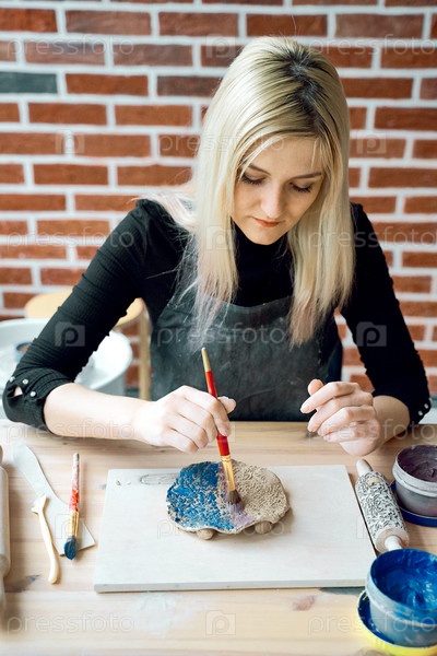 Женщина делает узор на керамической пластине с помощью кисти. Творческая концепция хобби. Зарабатывайте дополнительные деньги, подработка, превращая хобби в деньги, страсть в работу, вертикальный