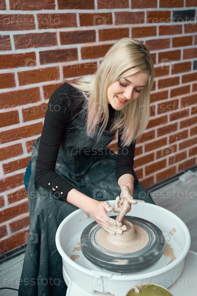 Счастливая женщина делает керамическую посуду на круге. Концепция для женщины в фрилансе, бизнесе, хобби. Зарабатывайте дополнительные деньги, превращая хобби в наличные, а страсть в работу. Красивая женщина улыбается