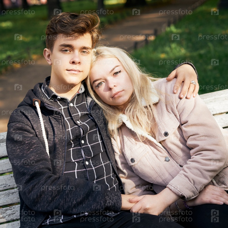 Подростки в любви сидят на скамейке в парке, отдыхая в лучах осеннего солнца, глядя прямо перед собой. Концепция подростковой любви