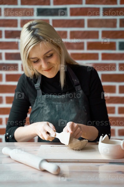 Счастливая женщина делает керамическую посуду, постучите лопаточкой. Концепция для женщины-фрилансера, бизнеса. Изделие ручной работы. Зарабатывайте дополнительные деньги, подработка, превращая хобби в деньги, а страсть в работу