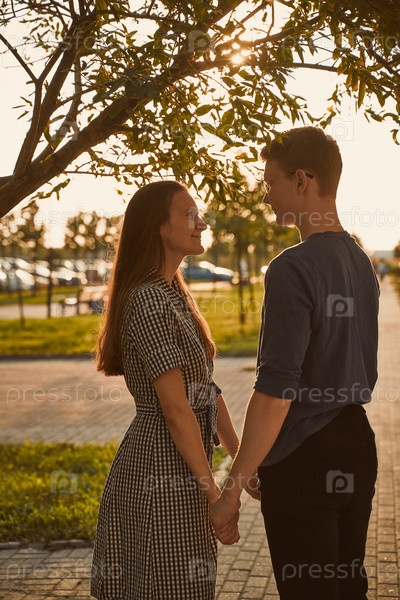 Партнеры по любви смотрят друг на друга в парке, концепция подростковой любви