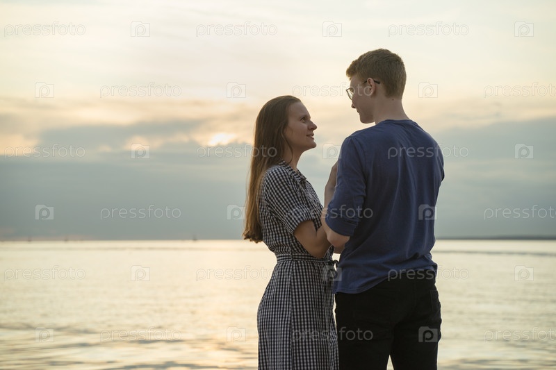 Мальчик и девочка смотрят друг на друга, на фоне пасмурной погоды на пляже
