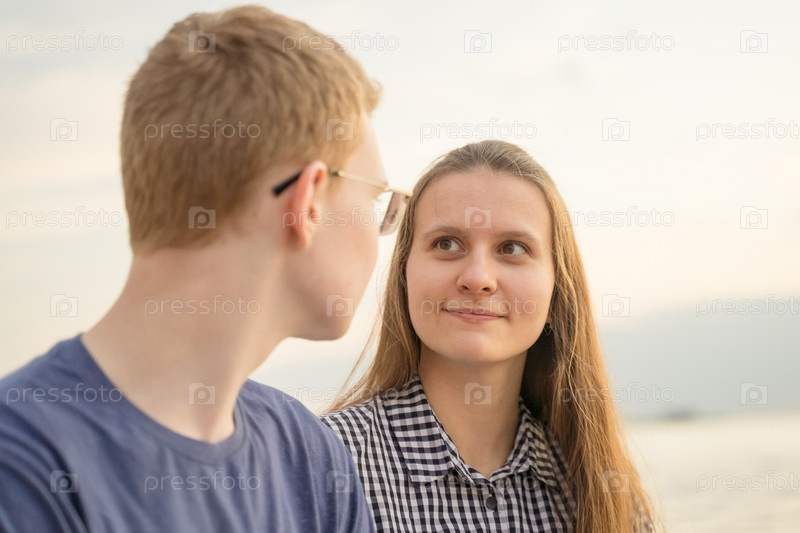 Девочка смотрит на мальчика на пляже на закате, концепция подростковой любви