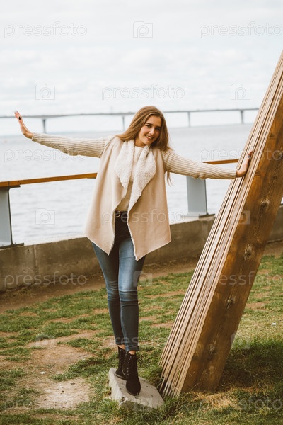 Счастливая молодая девушка стоит на набережной у пирса в порту, наслаждается жизнью и машет руками. Женщина с длинными волосами улыбается и наслаждается моментом