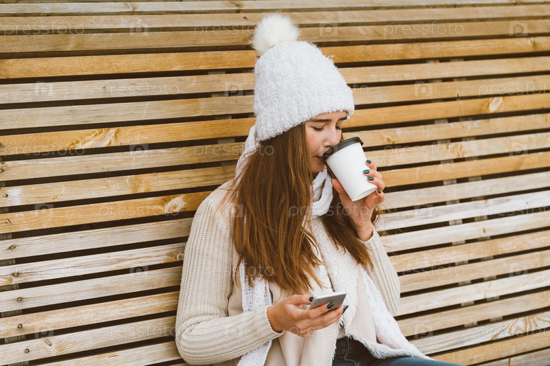 Красивая молодая девушка пьет кофе, чай из пластиковой кружки осенью, зимой и разговаривает по мобильному телефону. Женщина с длинными волосами сидит на скамейке осенью или зимой, греясь в горячем напитке, копировальное пространство