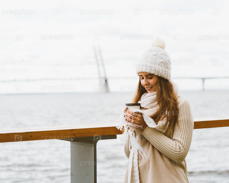 Красивая молодая девушка пьет кофе, чай из пластиковой кружки осенью, зимой. Женщина с длинными волосами стоит на набережной Балтийского моря в порту и ждет паром, согретый горячим напитком, копировальное пространство