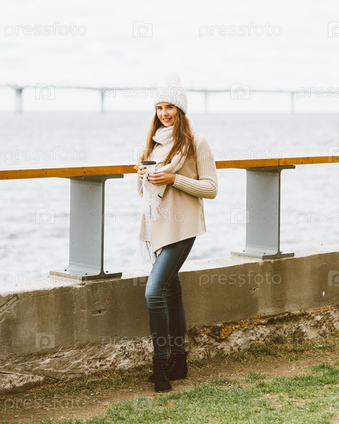 Красивая молодая девушка пьет кофе, чай из пластиковой кружки осенью, зимой. Женщина с длинными волосами стоит на набережной Балтийского моря в порту и ждет паром, согретый горячим напитком, копировальное пространство