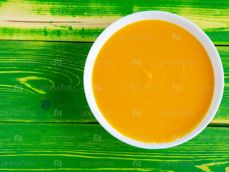 Вид сверху на белую тарелку с тыквенно-апельсиновым супом на ярко-зеленом деревянном фоне с местом для текста