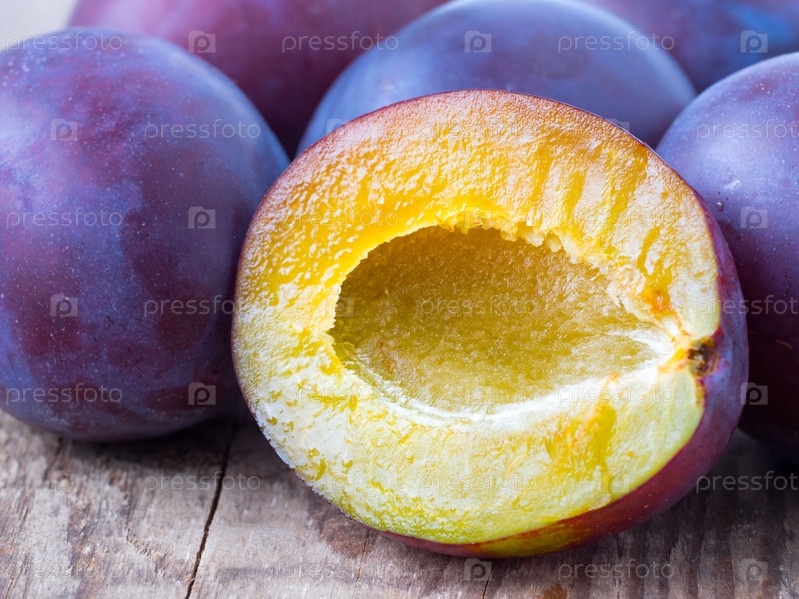 Крупная красная сладкая слива и разрезанная пополам