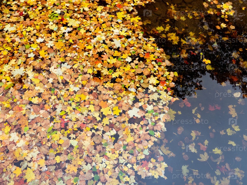 Ковер из множества красивых разноцветных листьев в воде, осеннее настроение