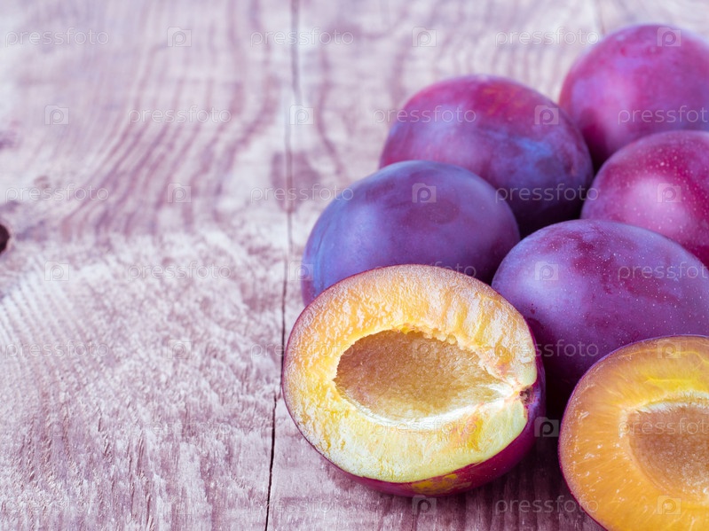 Крупная красная сладкая слива и разрезанная пополам