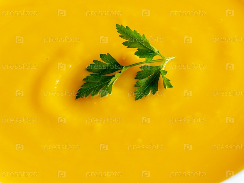 Ярко-оранжевый тыквенный суп с зеленью, макро