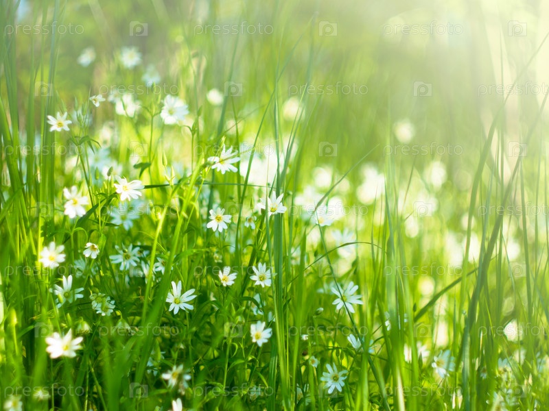 Луг с луговыми травами и нежными белыми цветочками в лучах солнца летним днем
